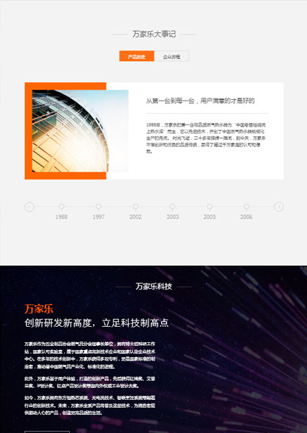 万家乐是一家专业从事清洁能源(燃气)和可再生能源(太阳能、空气能)的高效利用,以产品和服务为核心价值的低碳、智慧型企业集团,主营发展热水及关联产业(热水系统、采暖系统、水净化系统)和厨房及关联产业(整套厨电、集成橱柜、生活电器、空气净化器),为客户提供家居(商用)热水、采暖及厨房的产品及整体系统解决方案。