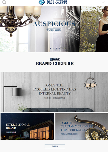 美时·艾菲特是国际灯饰品牌,产品注重原创设计,亦是国内美式灯行业的领导品牌 美时·艾菲特品牌创立于2001年,致力于中高档美式灯的设计开发和生产销售,在国内高端家居建材市场拥有近200家专卖店 产品远销北美、欧洲及中东地区 艾菲特灯饰设计出色,工艺精湛,产品从设计、工艺研发、生产制作整个流程都由自己完成 享有全面的创新自由,打造出令人交口称赞的灯饰精品