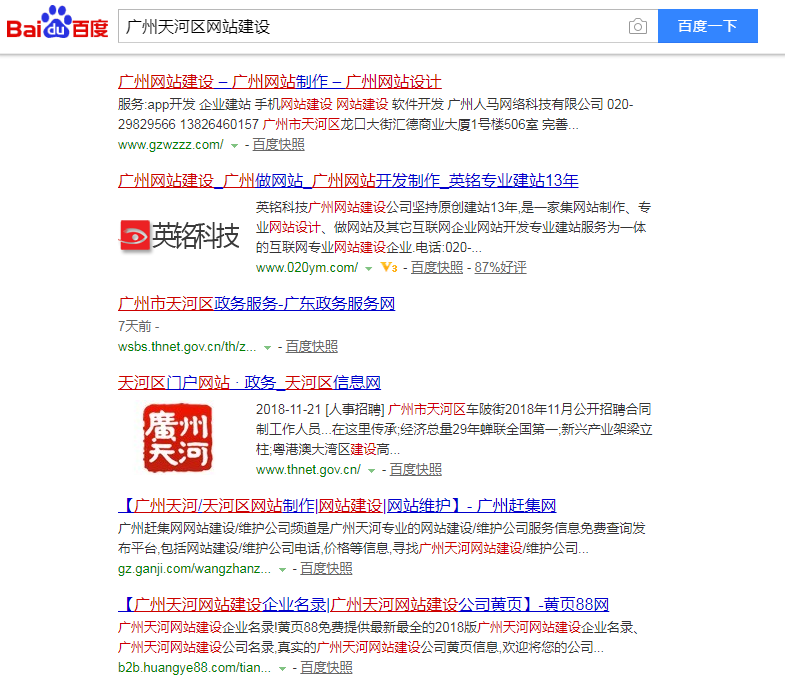 今天,我在百度搜索“广州网站建设”这个词时发现底部相关搜索里有一个“广州天河区网站建设”的词,出于好奇我就点击了这个词来查看一上搜索结果,也是想研究一下这样一个词百度究竟会如何排序结果,搜索结果如下: