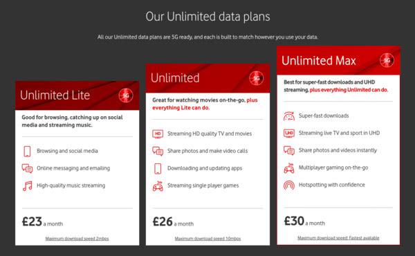 沃达丰的5G套餐按照网络速度分为三档,第一档是Unlimited Lite:每月资费为23英镑(约合198.5元),最高速度为2Mbps;第二档Unlimited每月资费为26英镑(约合224元)最高速度为10Mbps;第三档Unlimited Max每月资费为30英镑(约合259元),最高网络速度可达设备允许速度的上限,通常为150-250Mbps。